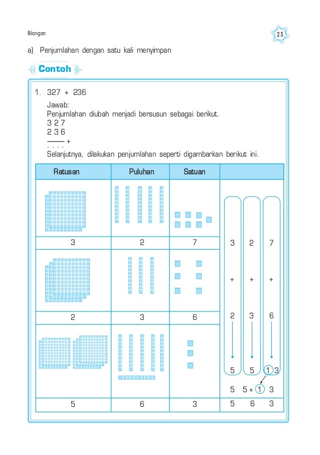 Namun sekali lagi, perkalian panjang biasa mungkin akan terasa lebih mudah diikuti. Namun, untuk bilangan seperti ini, kamu perlu memecahnya menjadi ratusan, puluhan, dan satuan. Siswa mengamati gambar kelompok 10 kubus dan kelompok 100 kubus. Alat peraga yang lain, misalnya bola bilangan atau stik es krim dapat digunakan Guru meminta anak secara bergilir meletakkan kartu bilangan di tempat yang sesuai pada papan nilai tempat, kemudian menuliskan lambang bilangannya. Siswa mendengarkan penjelasan guru cara membaca banyak kubus sesuai dengan gambar yang terdapat pada buku siswa. Siswa mengamati kelompok 1 ratusan kubus, tiga puluhan kubus, 8 delapan kubus. Seratus ribu, dan mempunyai papan nilai tempat satuan, puluhan, ratusan, ribuan, puluhan ribu, dan ratusan ribu, (sambil menunjuk ke papan nilai tempat yang telah dipersiapkan di papan tulis). Seperti pada kalkulator modern, setiap kolom memiliki "nilai tempat" yang kamu gunakan untuk membentuk angka. Siswa menyimak penjelasan guru tentang kubus satuan, kubus puluhan, dank kubus ratusan. Siswa berlatih menyatakan bilangan cacah menggunakan gambar alat peraga Sebagai contoh, untuk bilangan "162" kamu bisa membaginya menjadi "100", "60", dan "2". Untuk menghitung buku yang banyaknya ratusan.